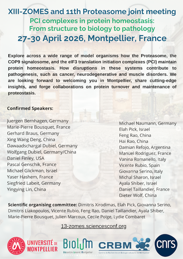 The 13th International ZOMES Conference will be held for the first time in France and will take place in conjunction with the Ubiquitin/Proteasome Meeting (Clermont-Ferrand). This joint event will provide a unique platform to explore the integrated roles of three major protein complexes essential for maintaining protein homeostasis: the Proteasome, the COP9 signalosome, and the eIF3 translation initiation complex. It brings together leading scientists from diverse disciplines, exploring ZOMES complexes across a wide range of model organisms. The conference will feature recent advances in the structural and functional characterization of these complexes, their role in cellular/environmental stress responses with emphasis on their coordinated roles in regulating protein turnover. Discussions will include how disruptions in these systems contribute to the pathogenesis of various diseases, such as cancer, neurodegenerative and muscle disorders. We are looking forward to welcoming you in Montpellier, share cutting-edge insights, and forge collaborations on protein turnover and maintenance of proteostasis.